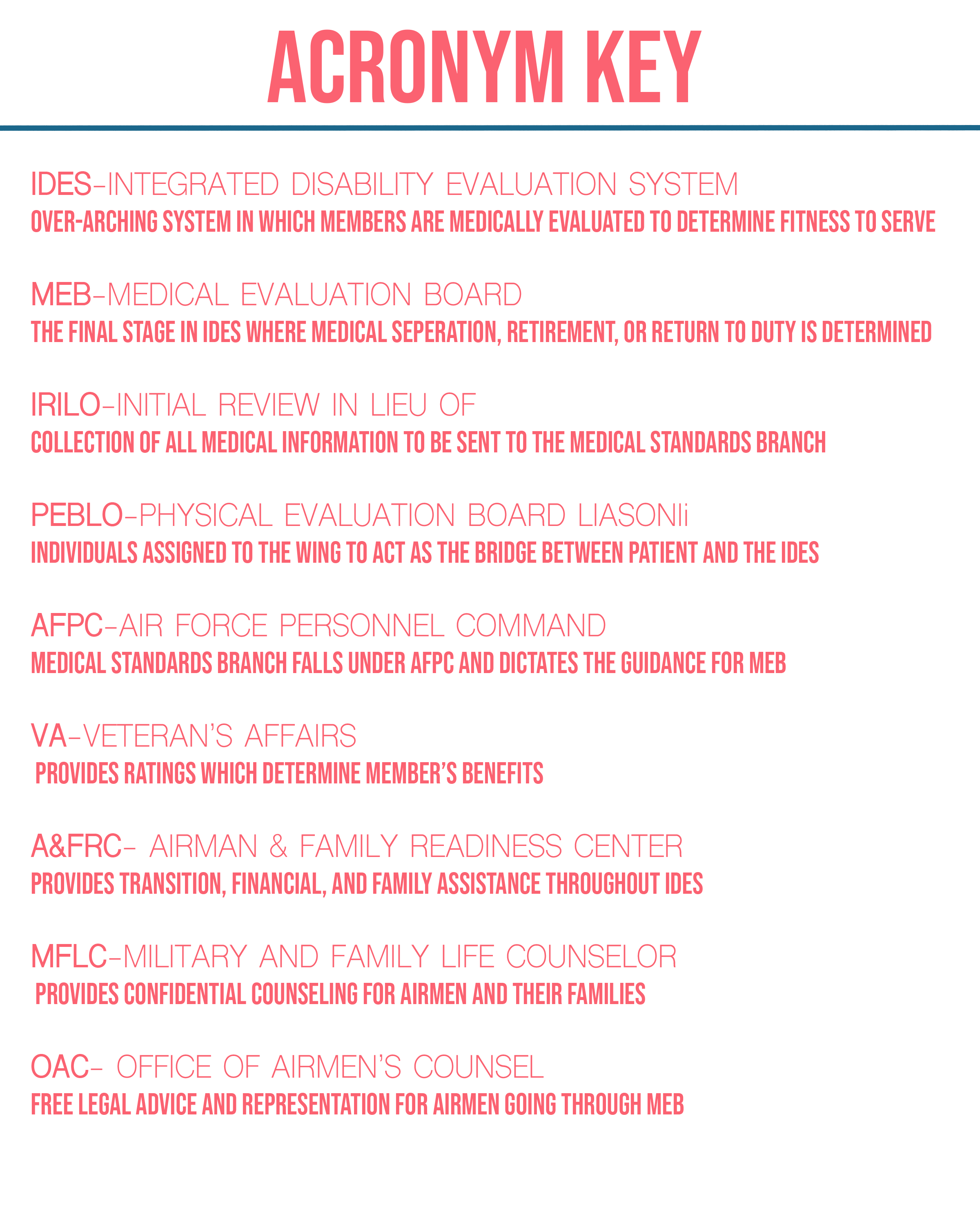 According to AFPC, “Airmen have the right to legal advice on their IDES case and legal representation by the Office of Airmen’s Counsel (OAC) at no expense. The OAC consists of attorneys who provide legal services to Airmen who are going through the IDES.”