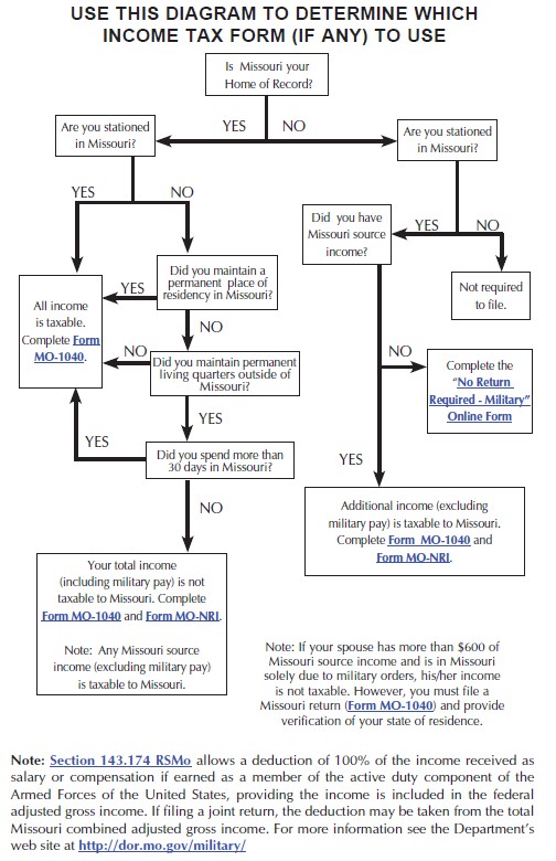 Below is an illustration provided by the Missouri Department of Revenue to help military members which form to use in Missouri. You should note, they use the term “Home of Record” to mean state of legal residence or domicile (while your Home of Record usually doesn’t change from the military’s perspective (your HOR is the location up to where the military will pay for you and your household goods to return to when you leave the military), you can change your state of legal residence/domicile during your career as discussed above).