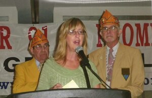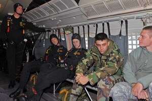 Black and white retro tiles spread across the floor. Lights illuminate food displays leading to the kitchen door. Stainless steel tables, ovens, freezers, bowls, pans and carts give the kitchen a silver shimmer. Airmen and civilians, carrying dishes of food, rush through steam seeping from an