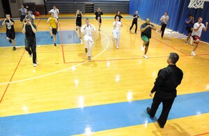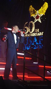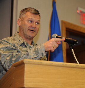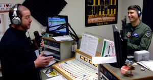 Col. John Robinson, 509th Bomb Wing vice commander, laughs at Bruce Enrietto, a 105.7 FM KXKX morning host, during the "Bruce in the Morning" radio show. Colonel Robinson was a guest co-host for the "Bruce in the Morning" show Jan. 30 and talked about different aspects of Team Whiteman while on the