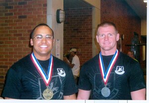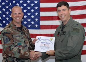Master Sgt. Brock Belknap, 509th Bomb Wing program security manager , and Tech. Sgt. Ben Au, 509th BW PSM, received the Whiteman Spirit Award from Col. John Robinson, 509th Bomb Wing vice commander, Aug. 6. Gerry Harley, 509th BW PSM, nominated Sergeants Belknap and Au for the award. Sergeants