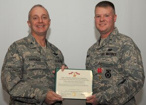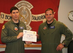 Capt. Michael Belardo, 13th Bomb Squadron, received the Whiteman Spirit Award from Col. John Robinson, 509th Bomb Wing vice commander, Nov. 19. Lt. Col. William Eldridge, 13th BS commander, nominated Captain Belardo for the award. Captain Belardo received the Spirit Award for contributing to the