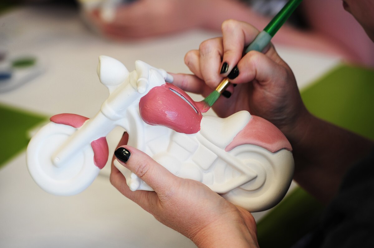 Senior Master Sgt. Mary-Dale Amison, 131st Bomb Wing Public Affairs superintendent, paints pottery with Lillian Johnson, 20th Reconnaissance Squadron sensor operator, during a Hearts Apart event at the Chartreuse Moose in Warrensburg, Mo., June 17, 2013. Although the event was targeted at spouses and dependents with deployed family members, anyone on base can attend. (U.S. Air Force photo by Staff Sgt. Nick Wilson/Released)