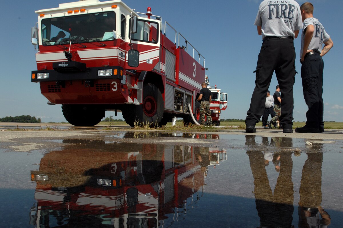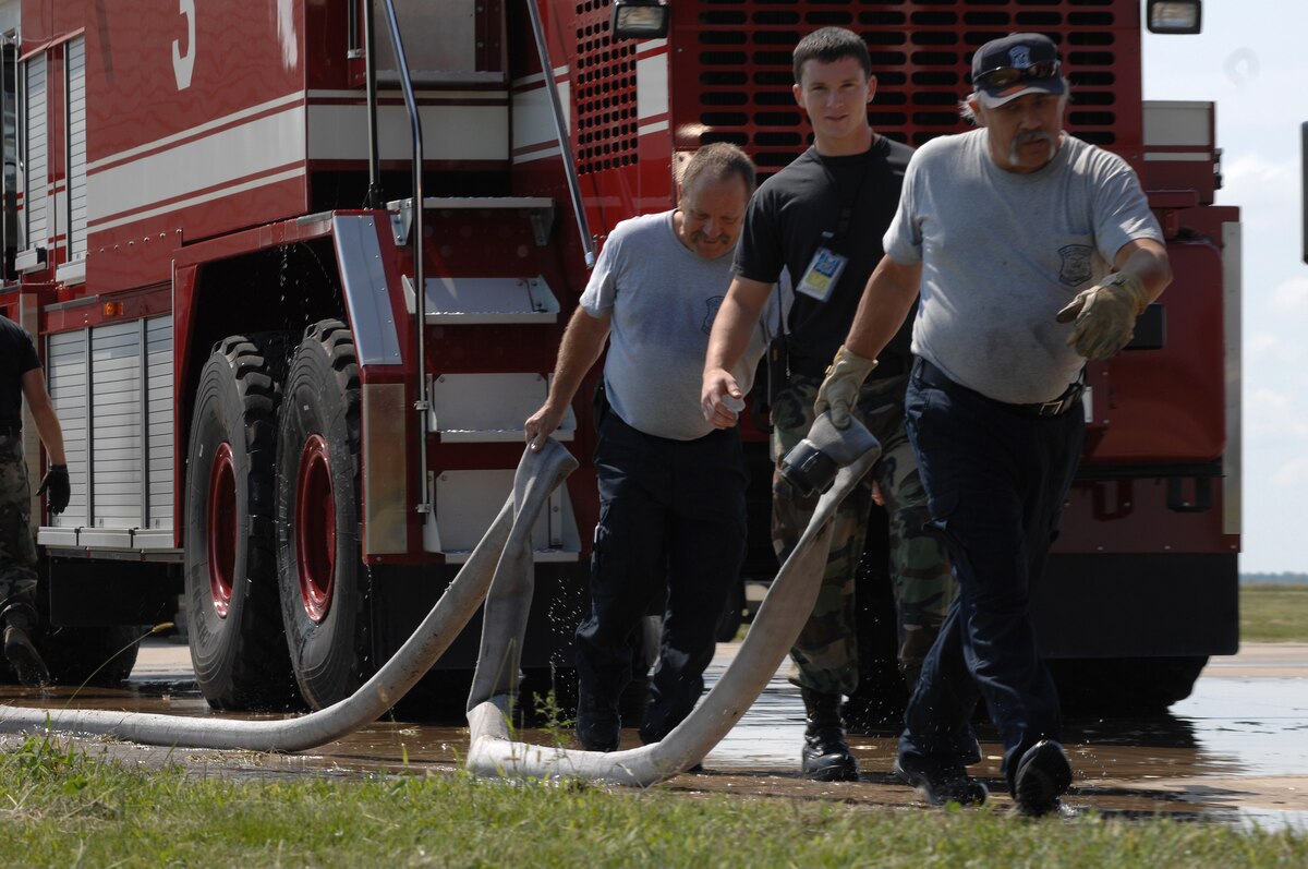 WHITEMAN AIR FORCE BASE, Mo. - Senior Airman Bryan Daspit, 509th Civil Engineer Squadron firefighter, gives the thumbs up to begin training after getting the aircraft training structure lit, Sept. 2. Enlisted and civilian firefighters battled hot flames for several hours during training in an effort to keep their qualification and skill up-to-date. The exercise is conducted once a year, and firefighters are put into several different scenarios where they are forced to react quickly and accurately. (U.S. Air Force photo/Senior Airman Kenny Holston)