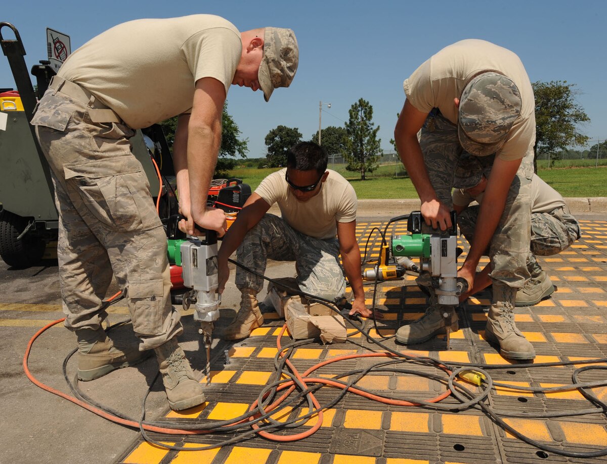 WHITEMAN AIR FORCE BASE, Mo. – Airman 1st Class Ralph Dagza, 509th Civil Engineer Squadron, uses an impact drill to run bolts into speed humps near Arnold Gate, Aug. 11. Each individual piece of the speed humps must be laid out and predrilled, then bolted down. Arnold gate is receiving three of these new fixtures to be completed by Aug. 12. The Lemay and Spirit gates will also be receiving these fixtures in the upcoming weeks. (U.S. Air Force Photo/Airman First Class Carlin Leslie)