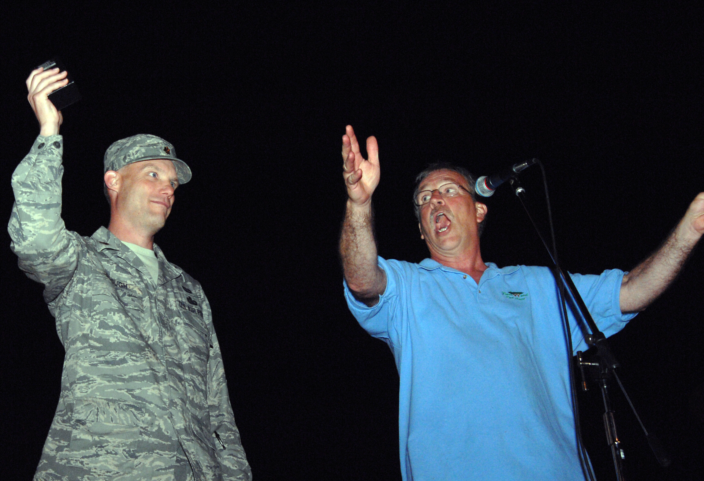 GREENWOOD, Mo. - Maj. Brian Clough, 509th Maintenance Operations Squadron research engineering flight commander, kicks off the fireworks display at the Greenwood, Mo. 19th Annual Independence Day Celebration June 27 with Mr. Dan Van Sickle, president of the city of Greenwood’s park board. Major Clough was selected to initiate the fireworks in honor of deployed and local military members who serve are currently serving and are veterans.