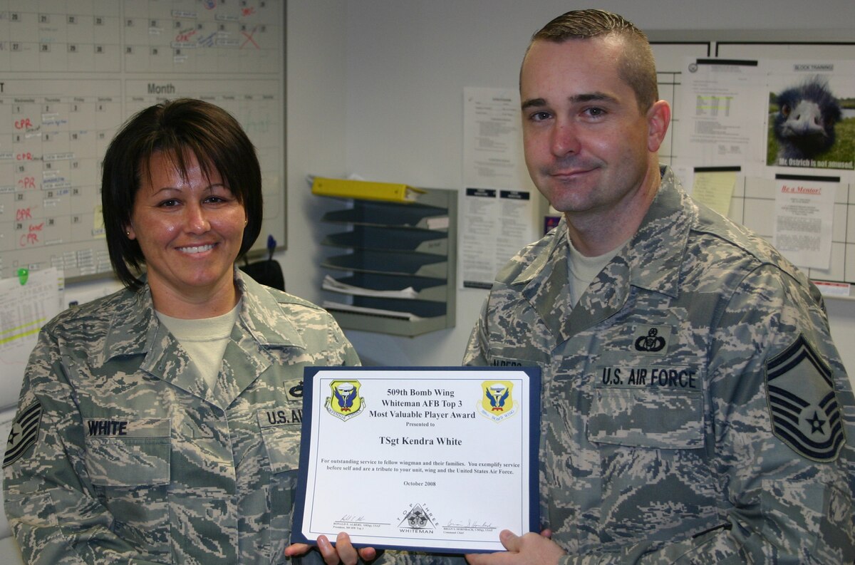 WHITEMAN AIR FORCE BASE, Mo. - Senior Master Sgt. Ron Albers, Whiteman TOP 3, presents the TOP 3 Most Valuable Player award to Tech. Sgt. Kendra White, 509th Munitions Squadron. Sergeant White was the non-commissioned officer in charge of squadron training during the 2008 LSET evaluation. She scrutinized more than 1000 documents for accuracy and validity. In addition, she completed a 100% review of course codes and lesson plans and helped her squadron’s 100% integration into training business administration. The Top 3 MVP award is given each month to any technical sergeant or below throughout the wing. This is the Top 3's way to formally recognize an enlisted individual who epitomizes mission accomplishment, teamwork and esprit de corps for the men and women of the 509th Bomb Wing. (Photo printed with permission of Master Sgt. Bartley Fischer)