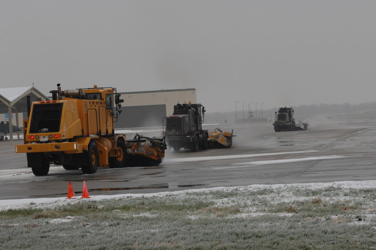 WHITEMAN AIR FORCE BASE, Mo. – Civil Engineer Squadron Snow Control plows the flight line Dec. 10. Two snow crews, one on the flight line and one on the base streets have been plowing since 7A.M. Dec. 9. (U.S. Air Force photo/Tech. Sgt. Samuel A. Park)