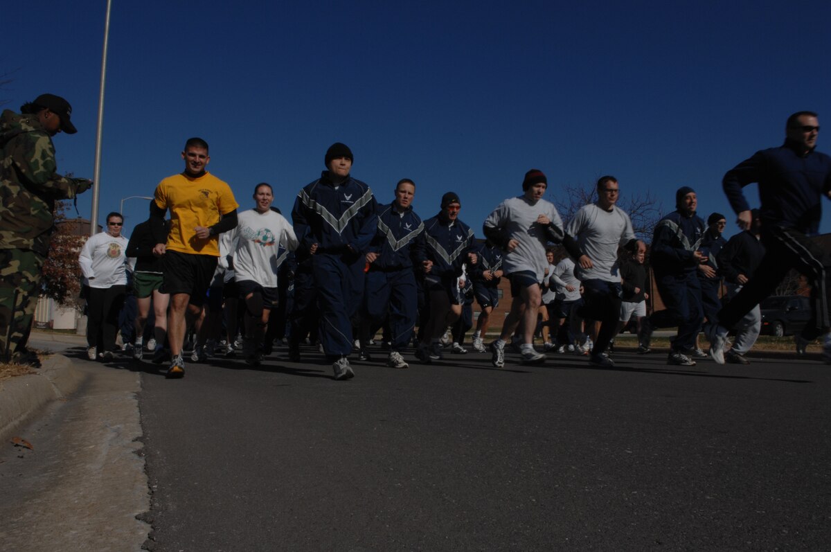 WHITEMAN AIR FORCE BASE, Mo. - More than 50 Team Whiteman members leave the starting line during the Food Bank 5k Fun Run/Walk at the Whiteman Fitness Center Nov. 9. Participants donated 94 food items to be used in Thanksgiving food baskets. (U.S. Air Force photo/Airman 1st Class Jessica Snow)