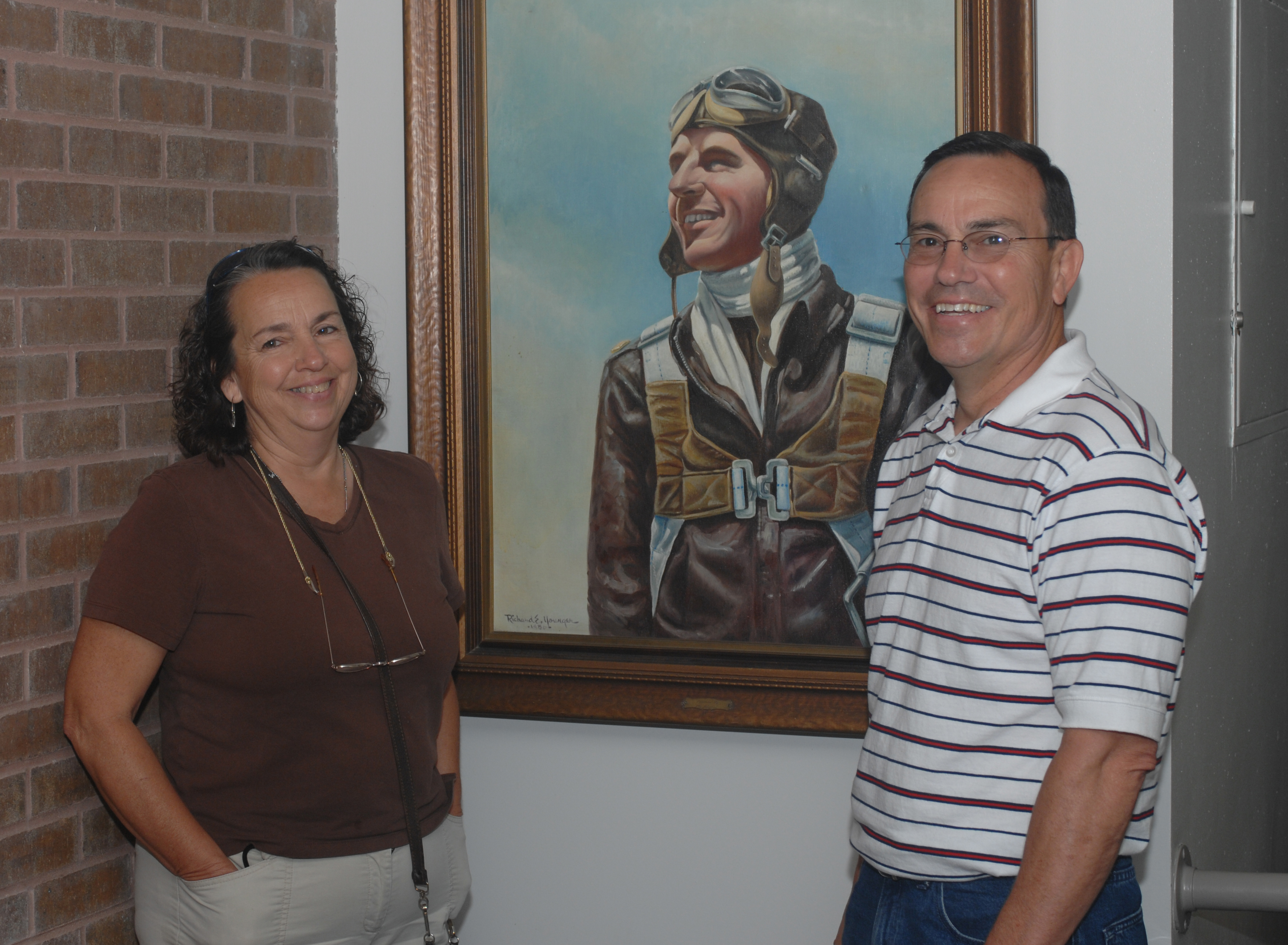 WHITEMAN AIR FORCE BASE, Mo. -- Cheryl Sisk and Glenn Berry pose next to a painting of their uncle, 2nd Lt. George Whiteman, at the 509th Bomb Wing headquarters building Sept 7. They also visited a B-2 Bomber and historical Oscar - 01 launch control facility during their tour. Sedalia Army Air Field became Whiteman Air Force Base Dec. 3, 1955 in honor of Lieutenant Whiteman. A native of Sedalia, the lieutenant was one of the first American Airmen killed in World War II when the Japanese attacked Pearl Harbor, Hawaii, Dec. 7, 1941. During the attack of Bellows Air Field, Oahu, Lieutenant Whiteman managed to reach his fighter aircraft. While attempting to take off, enemy fighters attacked his plane. Lieutenant Whiteman's P-40 crashed, fatally injuring him. By the time rescue teams reached the aircraft, the lieutenant had died. (U.S. Air Force Photo/Tech. Sgt. Samuel A. Park)