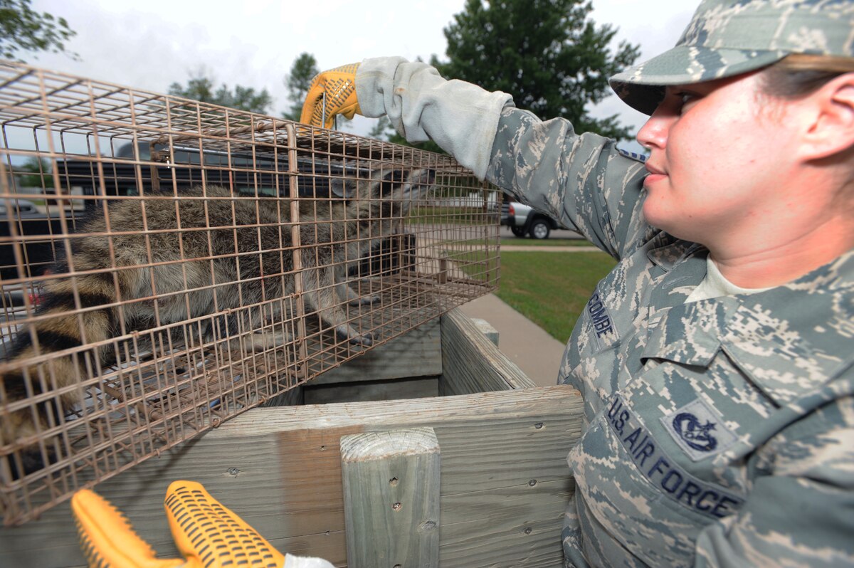 WHITEMAN AIR FORCE BASE, Mo. - Staff Sgt. Linnea Holcombe, 509th Civil Engineer Squadron Entomology flight, releases the recently caught raccoon to the wild, Aug. 17. Whiteman Airman are reminded, due to legality reasons, to contact Entomology for relocation of wild animals. For more information call the shop at (660) 687-6367(U.S. Air Force photo by Senior Airman Carlin Leslie)