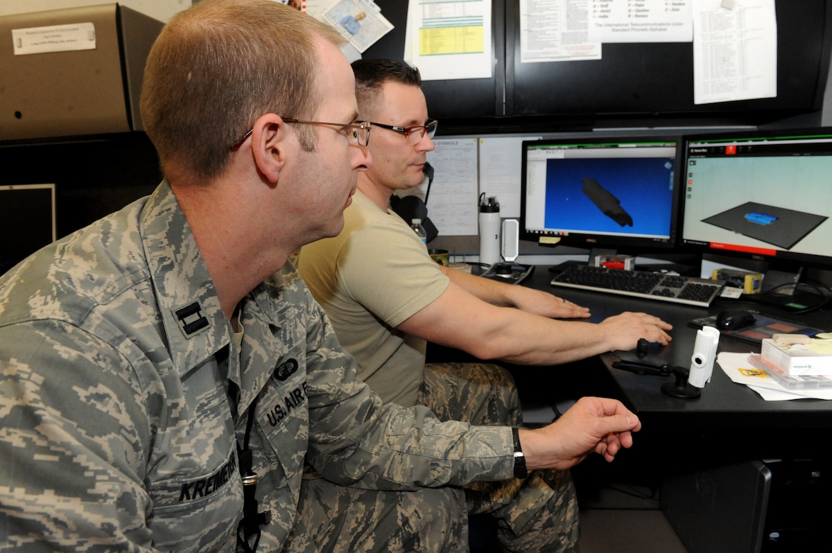 U.S. Air Force Capt. Wayne Kreimeyer, the 509th Maintenance Group (MXG) Research and Engineering (RE) flight commander, right, discusses circuit designs for a portable sensor tester with Tech. Sgt. Billy Doser, an RE technician with the 509th MXG, at Whiteman Air Force Base, Mo., Feb. 18, 2016. The tester, operated by micro-controllers, tests multiple sensors on hydraulic reservoirs from the B-2 aircraft by inputing a variety of voltages and displaying the results on an LCD. (U.S. Air Force photo by Tech. Sgt. Miguel Lara III)