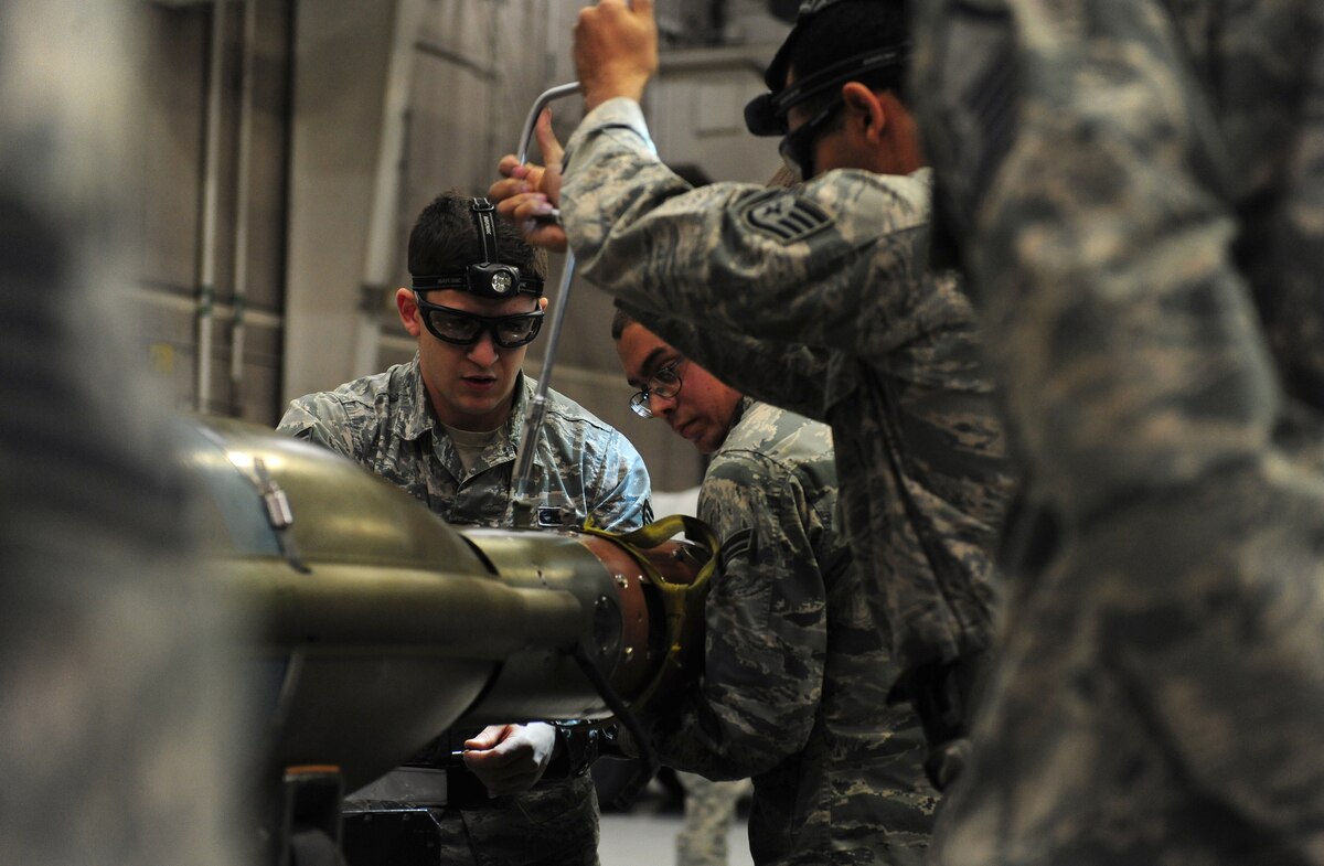 Senior Airman Christopher Orsi, a 13th Aircraft Maintenance Unit load crew member, secures a GBU-28 B/B into a B-2 Spirit weapons load trainer at Whiteman Air Force Base, Mo., Jan. 13, 2016. Load competitions are held quarterly to test the crew’s ability to load weapons in a timely and precise manner. (U.S. Air Force photo by Senior Airman Joel Pfiester)