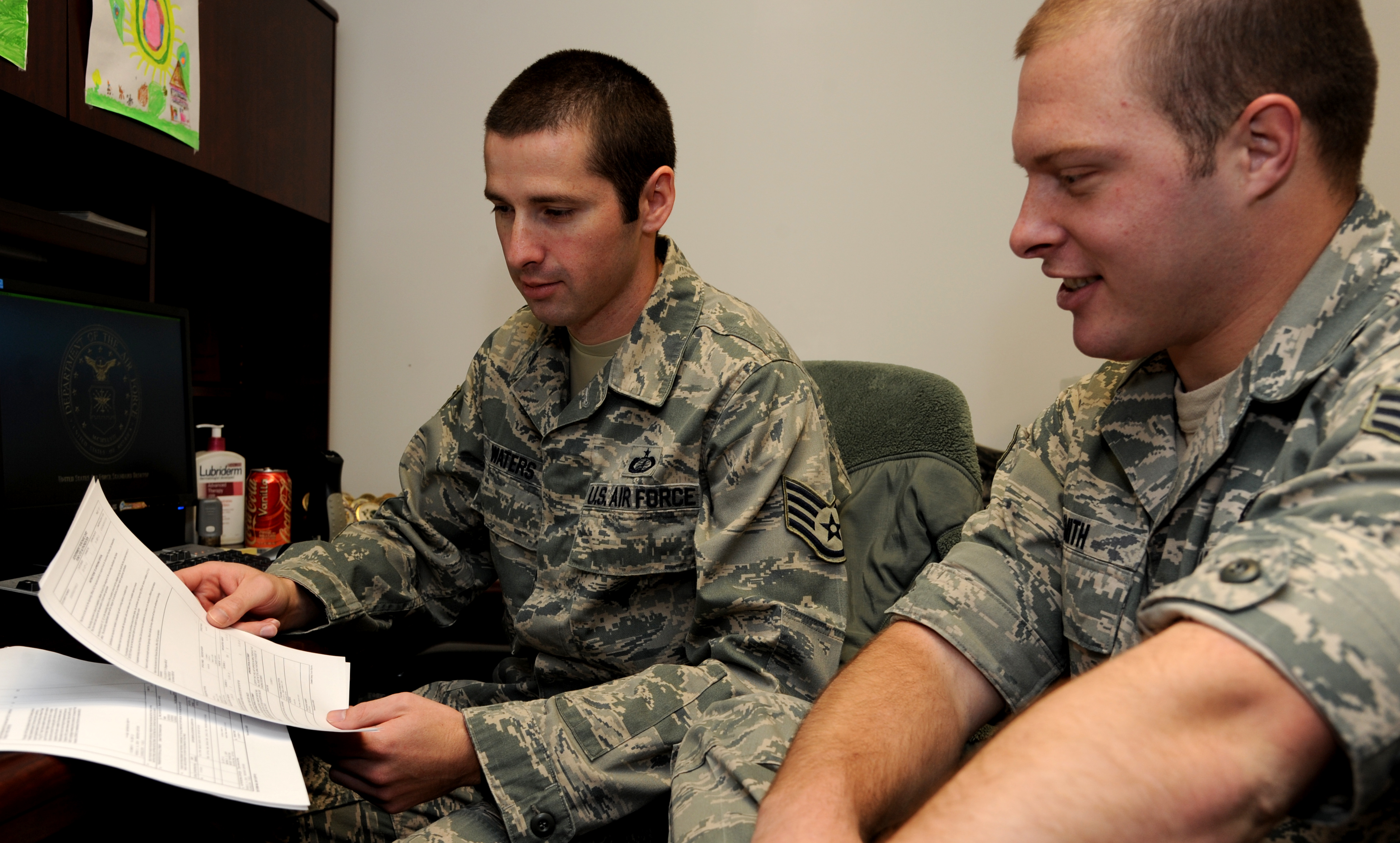 Staff Sgt. Thomas Waters, 509th Comptroller Squadron budget supervisor, performs on-the-job training with Senior Airman Patrick Smith, 509th CPTS, at Whiteman Air Force Base, Oct. 29. Waters was the first Diamond Sharp winner, the First Sergeants Council’s recognition for Airmen who have stood out while performing the mission. (U.S. Air Force photo/Senior Airman Montse Belleau) (Released)