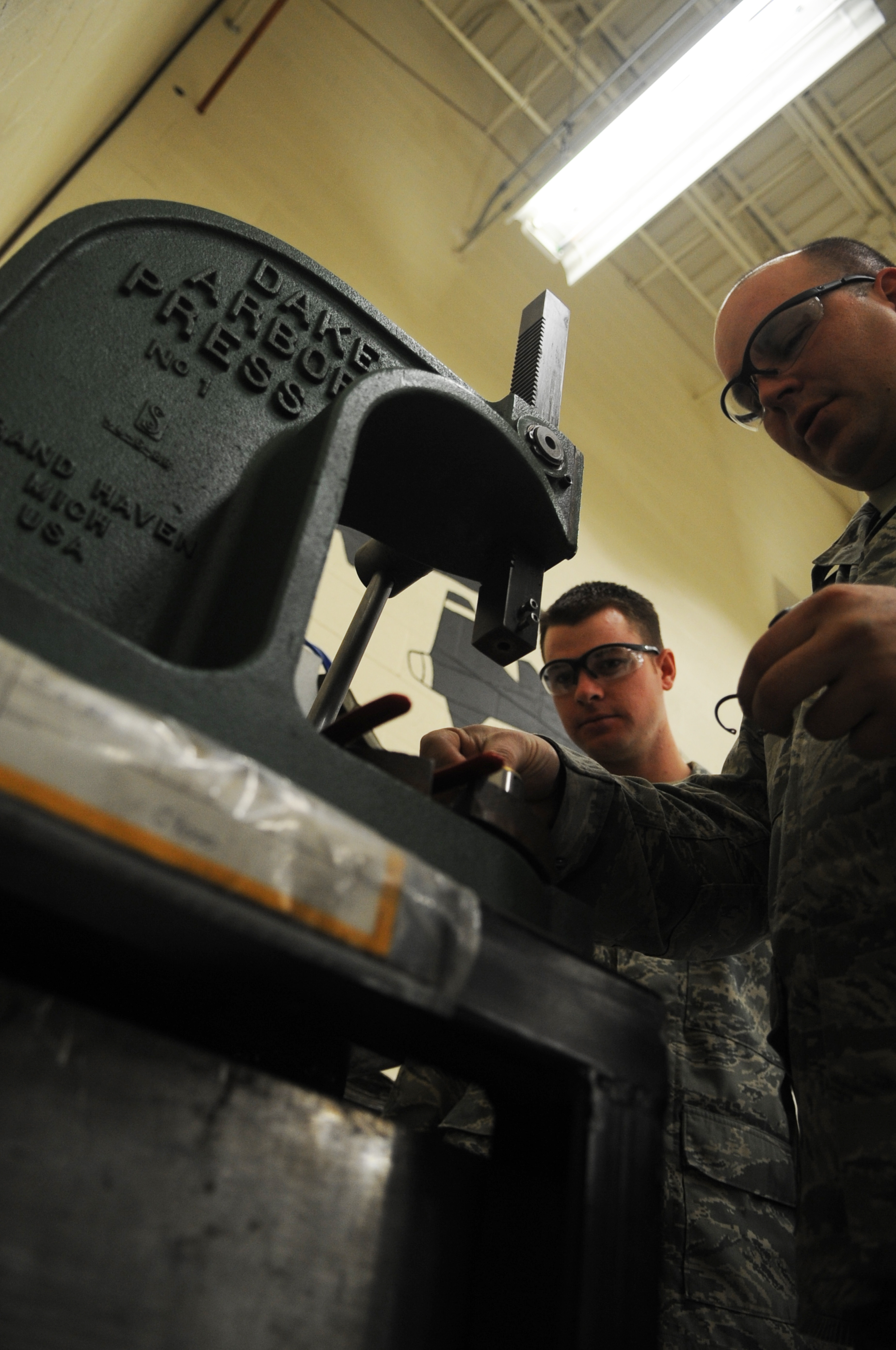 509th Maintenance Squadron members perform maintenance in the hydraulics shop, Feb 17, 2011. (U.S. Air Force photo by Senior Airman Kenny Holston)(Released)