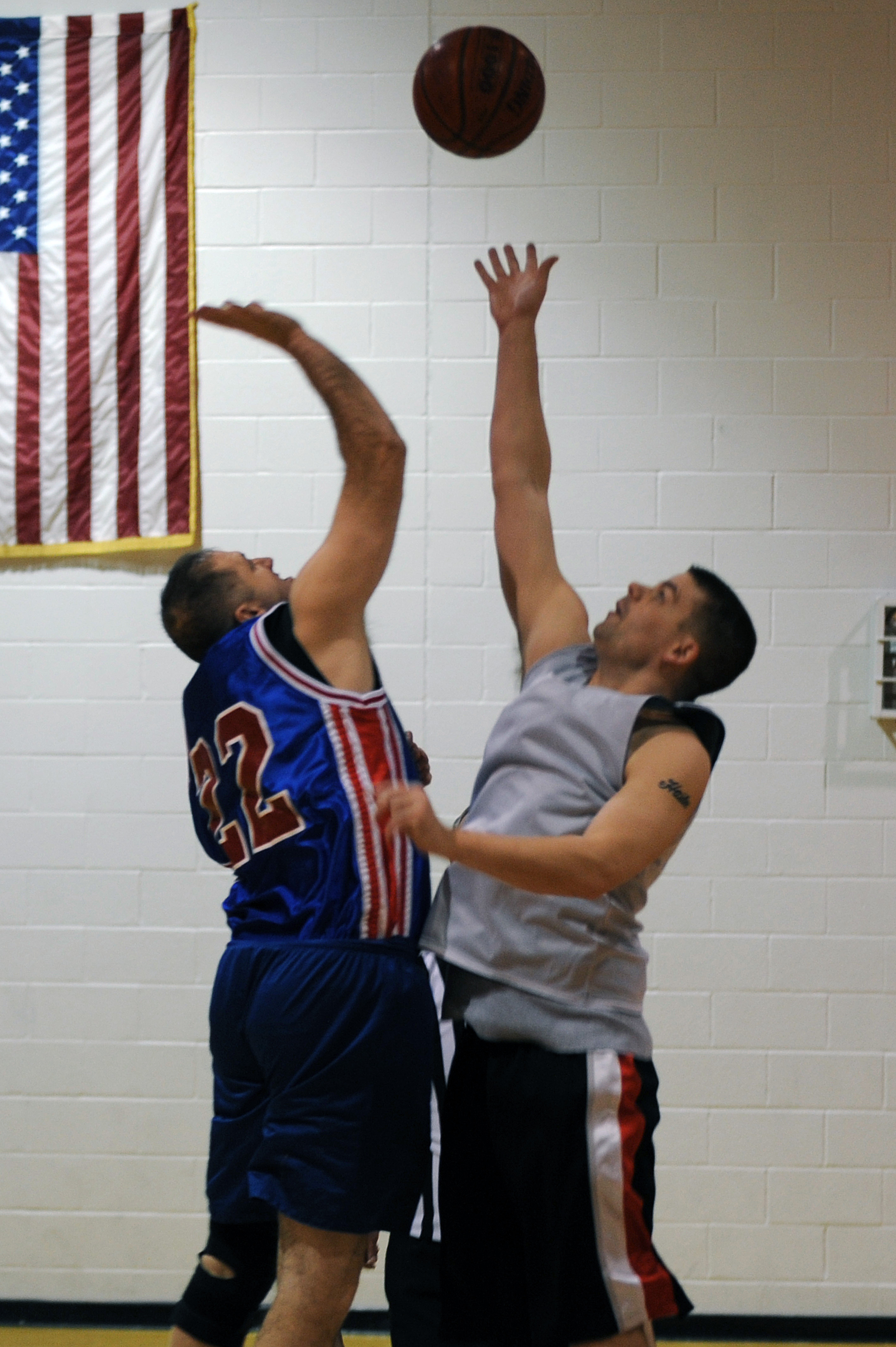 WHITEMAN AIR FORCE BASE, Mo., -- A 509th Maintenance Squadron team member and a 509th Operation Support Squadron team member jumps for the ball during an over 30 basketball league game. (U.S. Air Force photo/Staff Sgt. Jason Huddleston) (Released)