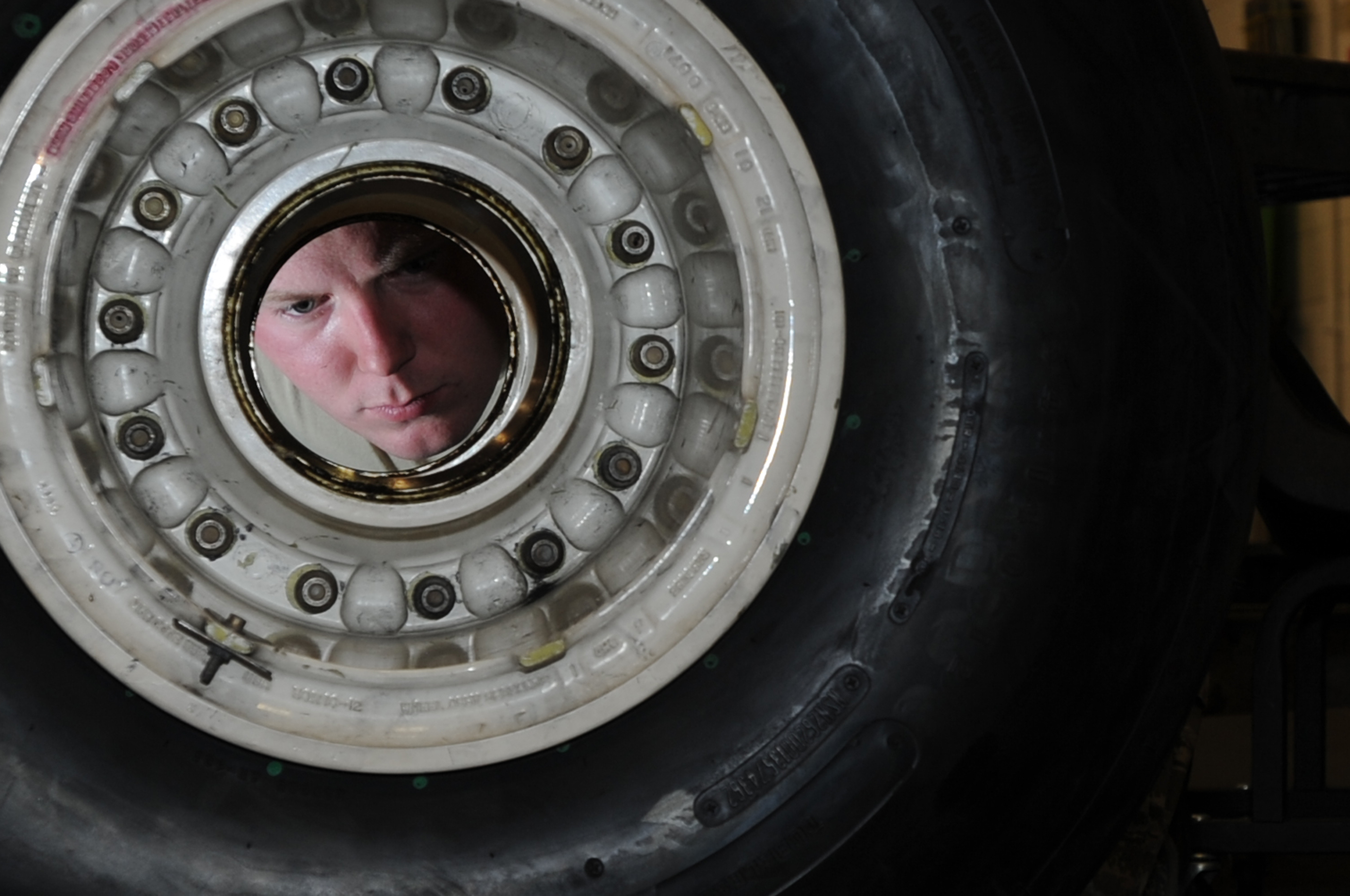 WHITEMAN AIR FORCE BASE, Mo. - Airman 1st Class Ryan Scott, 509th Maintenance Squadron wheel and tire technician, inspects the B-2 nose tire before it will receive its bearings, Nov.8. The wheel and tire shop inspects each piece of the build intensively, ensuring all steps are followed and the tires are built according to standards. (U.S. Air Force photo by Senior Airman Carlin Leslie)