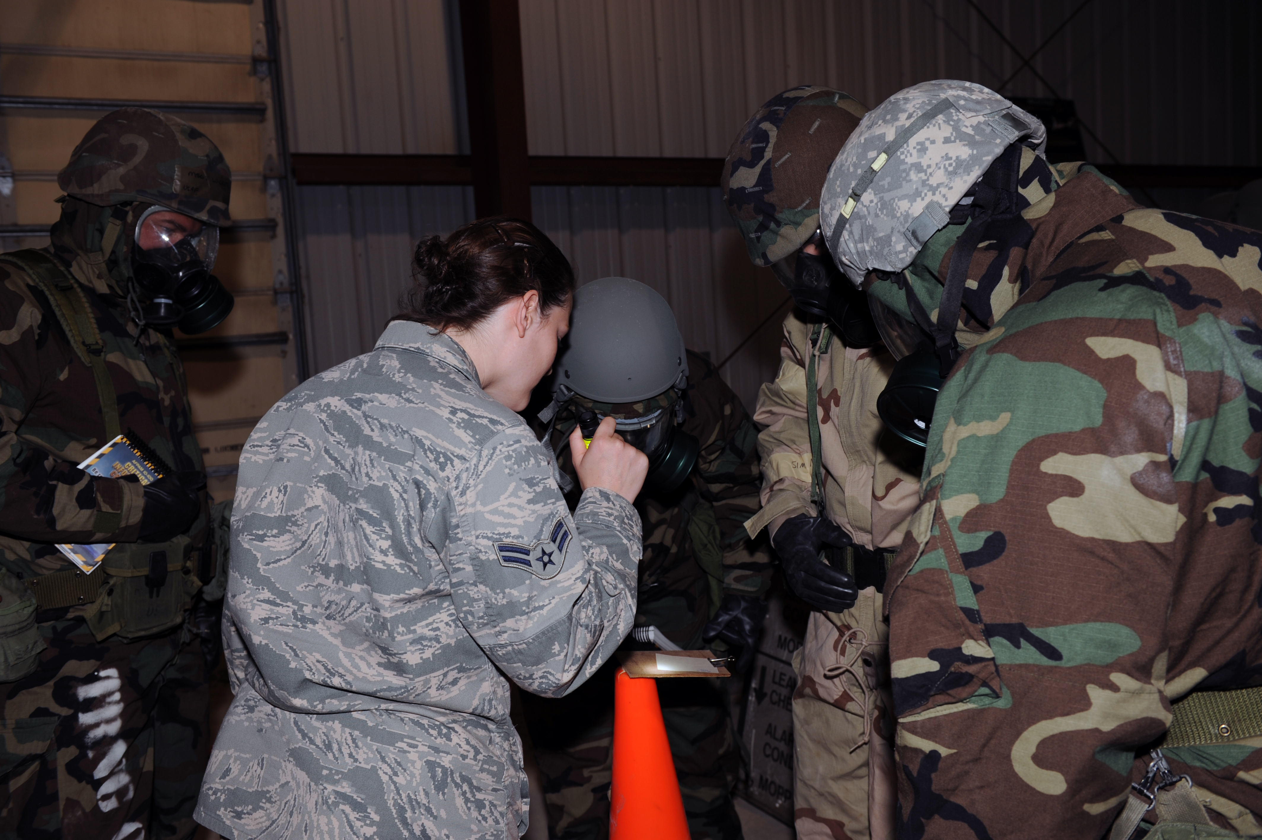 WHITEMAN AIR FORCE BASE, Mo., -- Airman 1st Class Samantha Bauer, 509th Civil Engineer Squadron emergency management, looks at M8 paper with Airmen deciding if there was contamination by checking to see if the paper changed colors during the Chemical Biological Radiological Nuclear Explosive Agents Training course. (U.S. Air Force photo/Staff Sgt. Jason Huddleston) (Released)