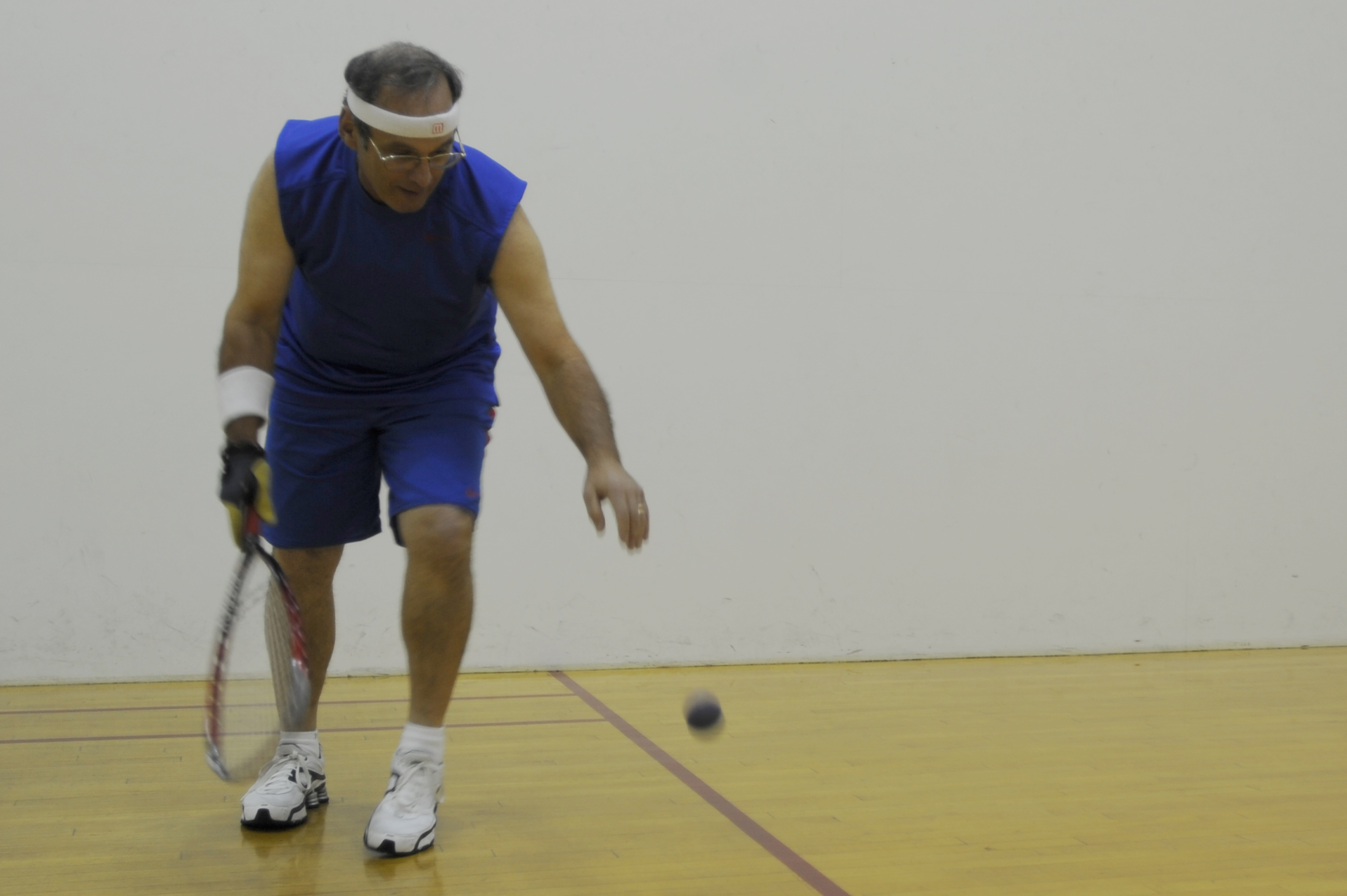 WHITEMAN AIR FORCE BASE, Mo. - Mr. Paul Rizzo, retired Air Force, serves during a game of racquet ball at the Fitness Center. The Fitness Center offers weight lifting, circuit training, treadmill and other workout equipment to stay physically fit in addition to preparing for physical fitness tests. (U.S. Air Force photo by Senior Airman Carlin Leslie)