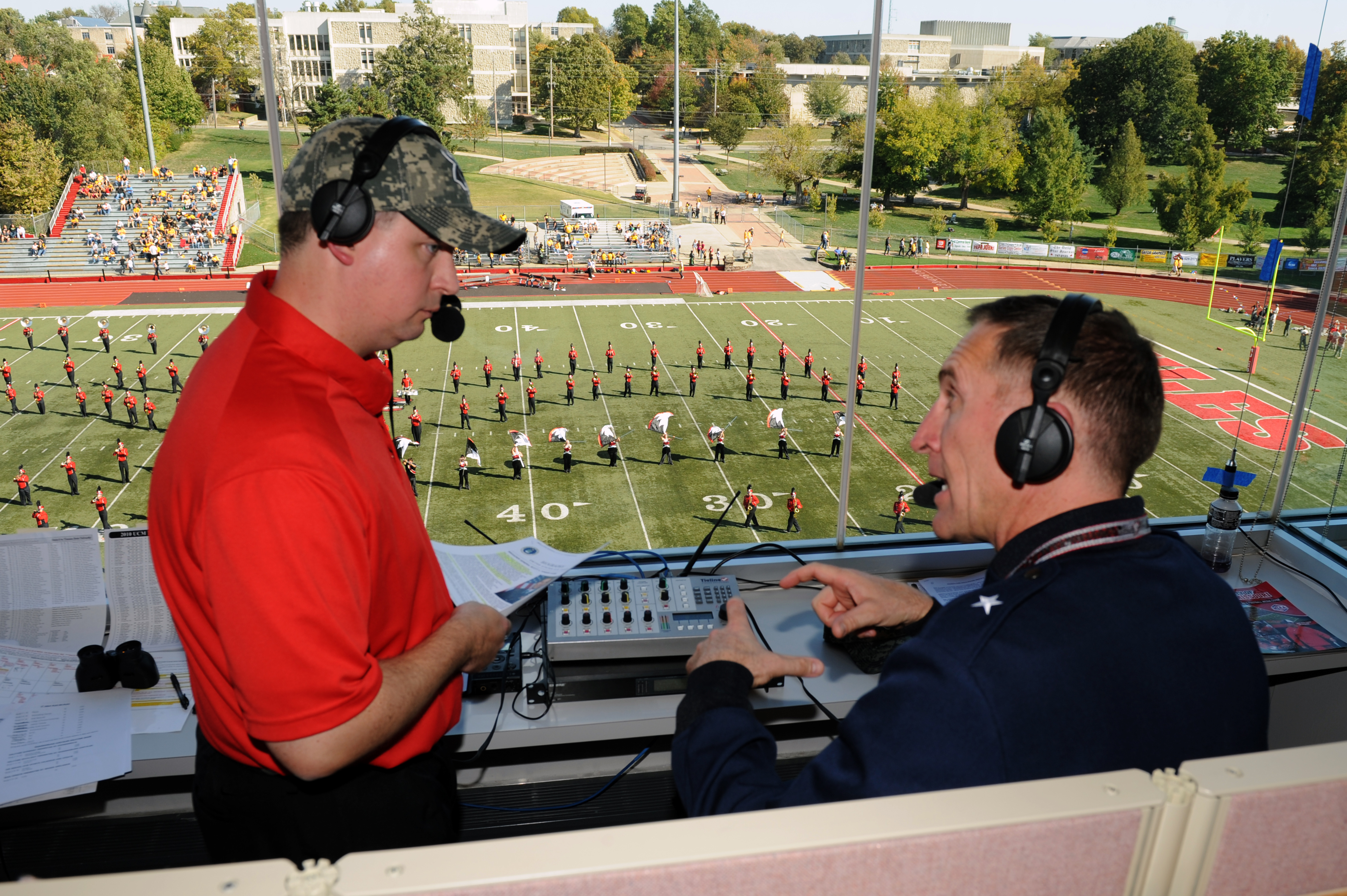 WHITEMAN AIR FORCE BASE, Mo. --Shawn Jones, radio announcer for University of Central Missouri athletics, interviews Brig. Gen. Scott Vander Hamm, 509th Bomb Wing commander, at half time of the UCM vs. Missouri Western State University game, Saturday. UCM hosted Military Appreciation Day to honor servicemembers and their families and provided free admission to the football game. (U.S. Air Force photo/Staff Sgt. Jason Huddleston) (Released)