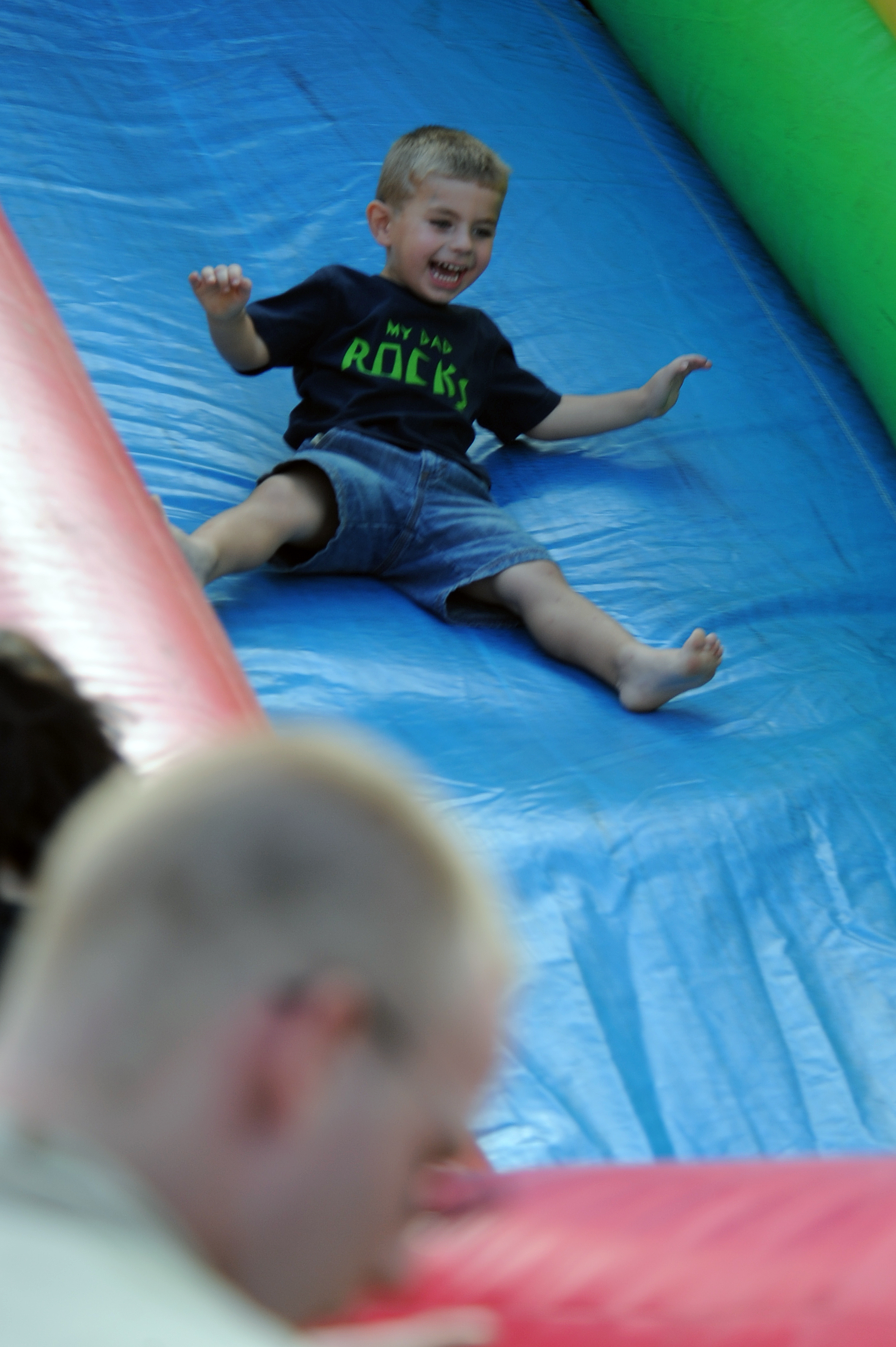 WHITEMAN AIR FORCE BASE, Mo., -- Hunter Meyer, son of Shawn Meyer, slides down the inflatable slide display at the 2010 Wings Over Whiteman Air Show and Open House Sept. 19. (U.S. Air Force photo/Staff Sgt. Jason Huddleston) (Released)