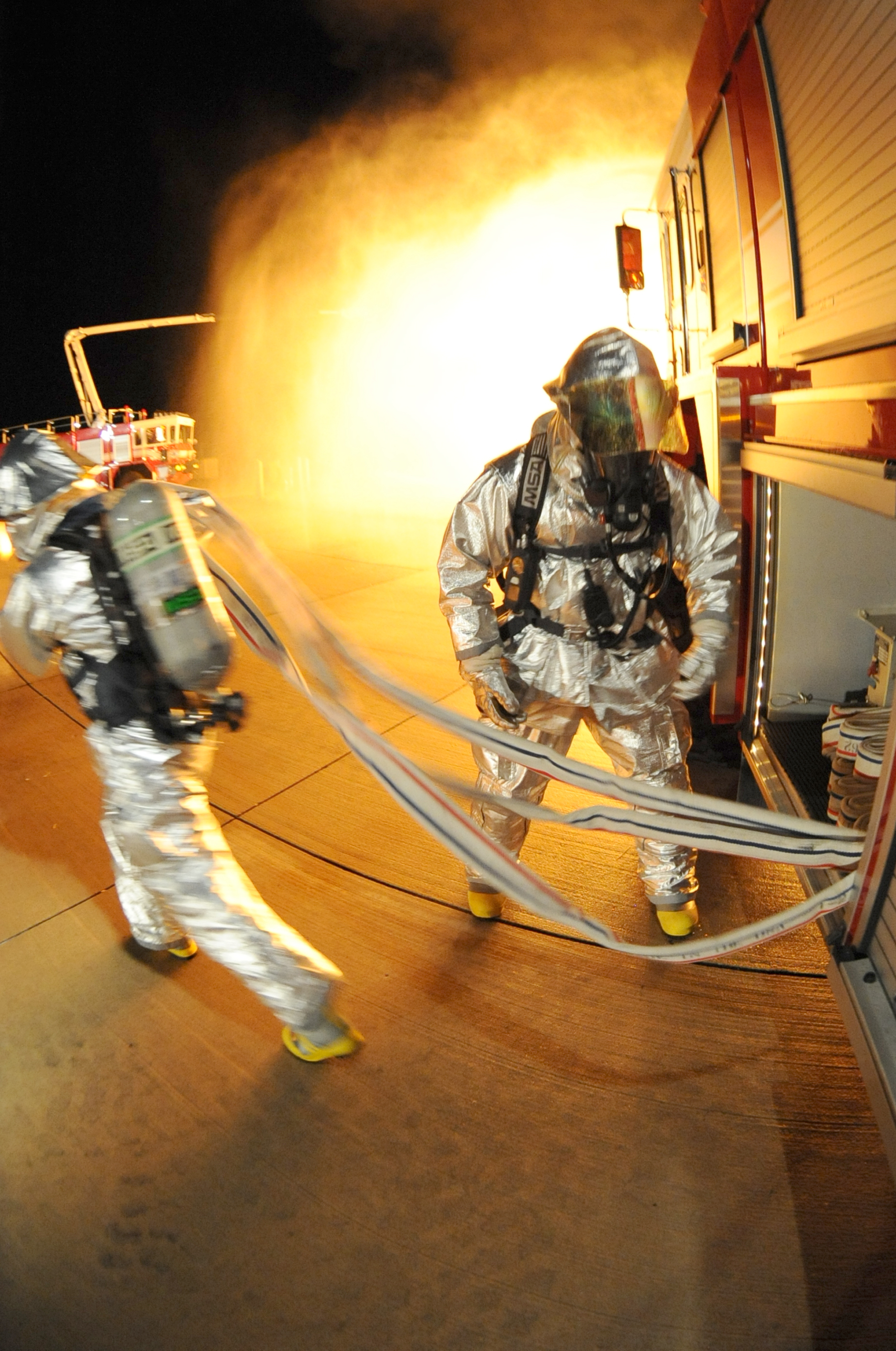WHITEMAN AIR FORCE BASE, Mo. - Senior Airman Derrick Allen and Airman 1st Class Shane Savage, 509th Civil Engineer Squadron firefighters guide the hand line out of a crash truck while another Airman pulls the line across the ground stretching it out during an exercise here, Aug.23. A two-man hand line is deployed to extinguish the existing flames after crash trucks extinguish the bulk of the fire. (U.S. Air Force Photo by Senior Airman Carlin Leslie)