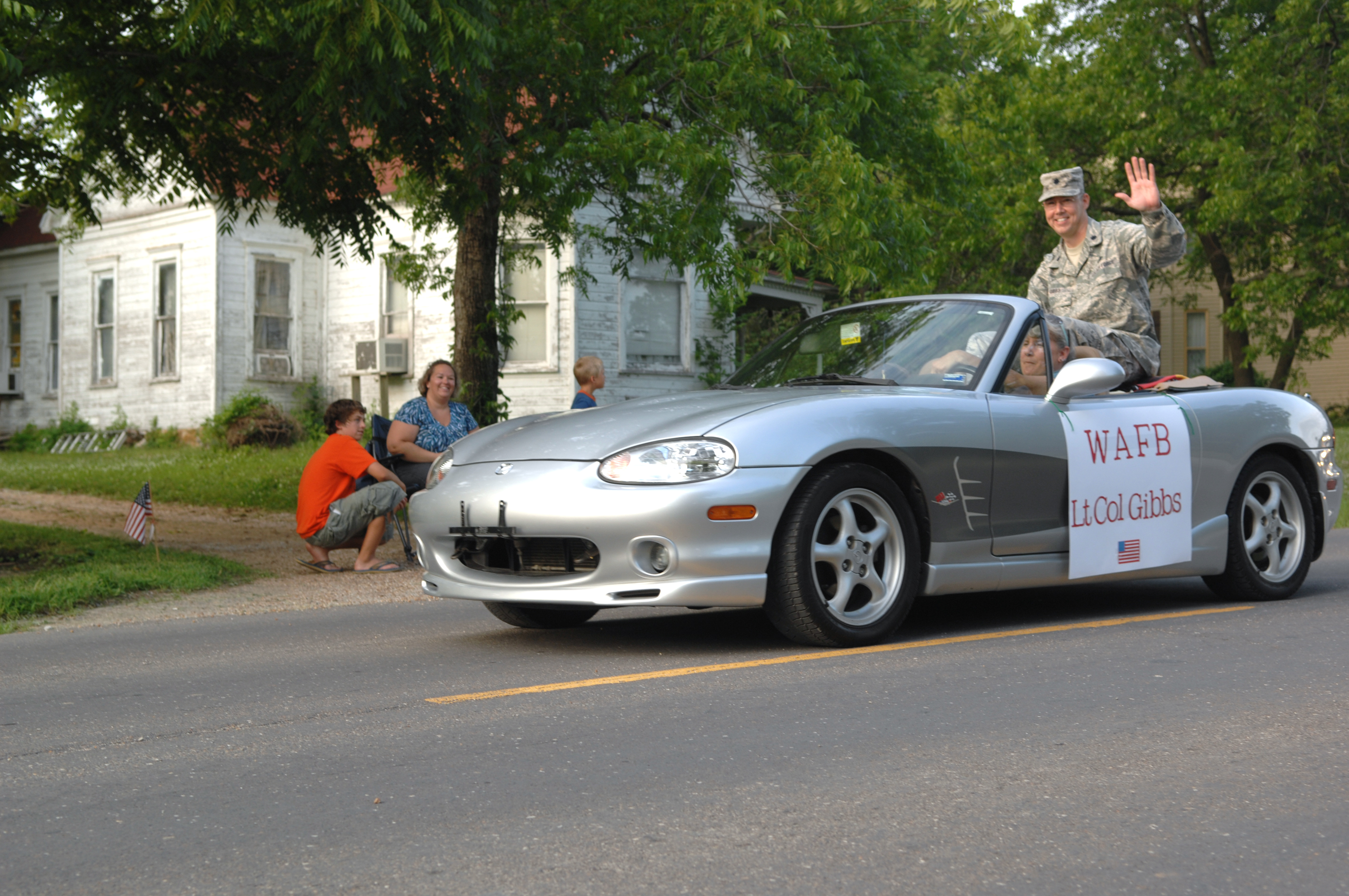 KNOB NOSTER, Mo. - Lt. Col. Richard Gibbs, 509th Maintenance Squadron commander, waves to the crowd during the Knob Noster parade, June 10. The parade signified the beginning of the Knob Noster fair.
