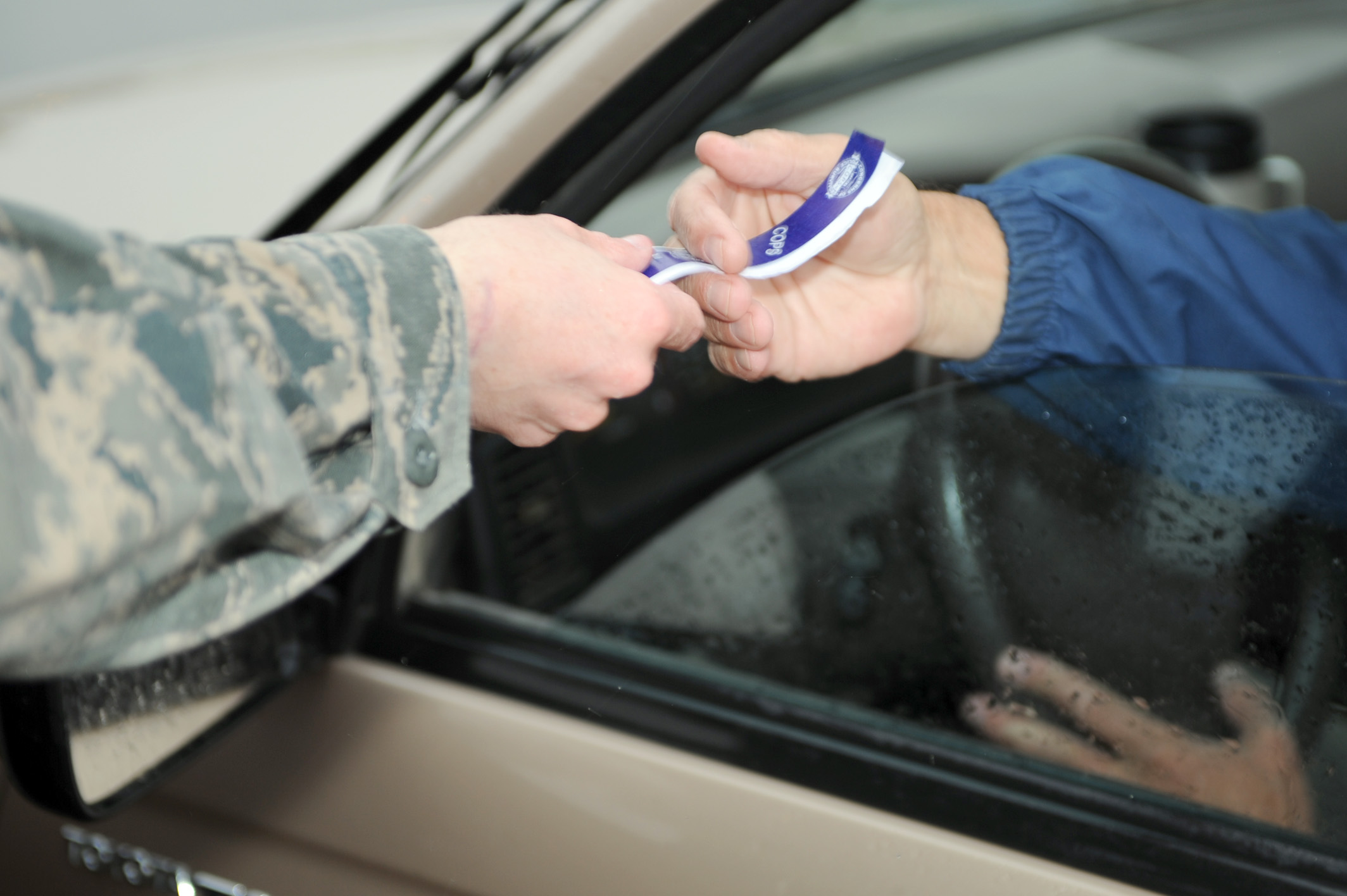 WHITEMAN AIR FORCE BASE, Mo.- As members of Team Whiteman arrive on base, they receive a blue ribbon to display on their vehicles in support of National Police Week, May 10. Concerns of Police Survivors, an organization labeled on the blue ribbons, provides support for coworkers and family members of fallen officers. (U.S. Air Force photo/ Airman 1st Class Carlin Leslie)