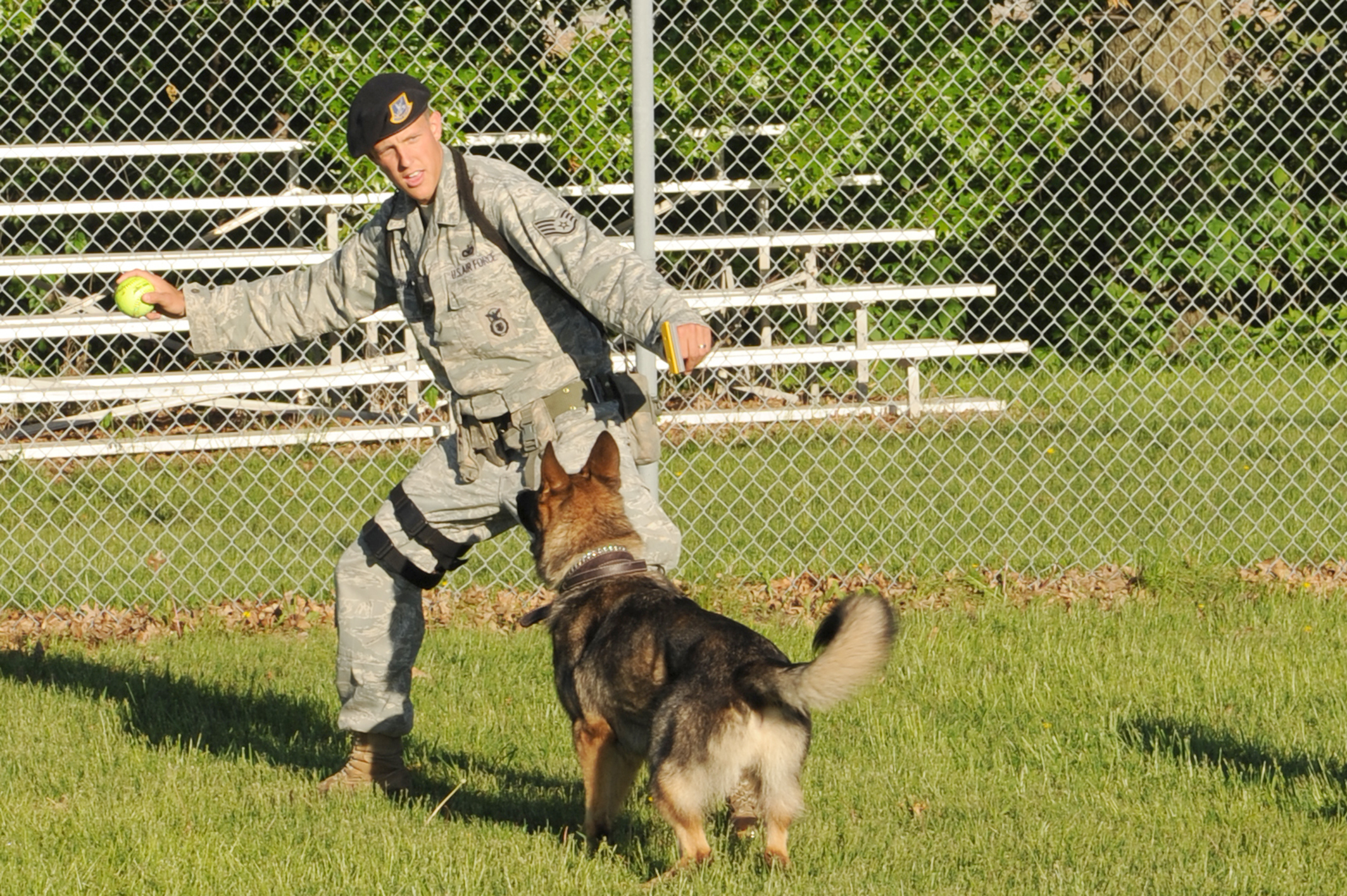 WHITEMAN AIR FORCE BASE, Mo. - Staff Sgt. Alex Holloway, 509th Security Forces Squadron military working dog handler, throws a softball for his partner Norbo to fetch for exercise, May 4, 2010. MWDs are used in patrol, drug and explosive detection, and specialized mission functions for the Department of Defense and other government agencies. (U.S. Air Force photo/Airman 1st Class Carlin Leslie)