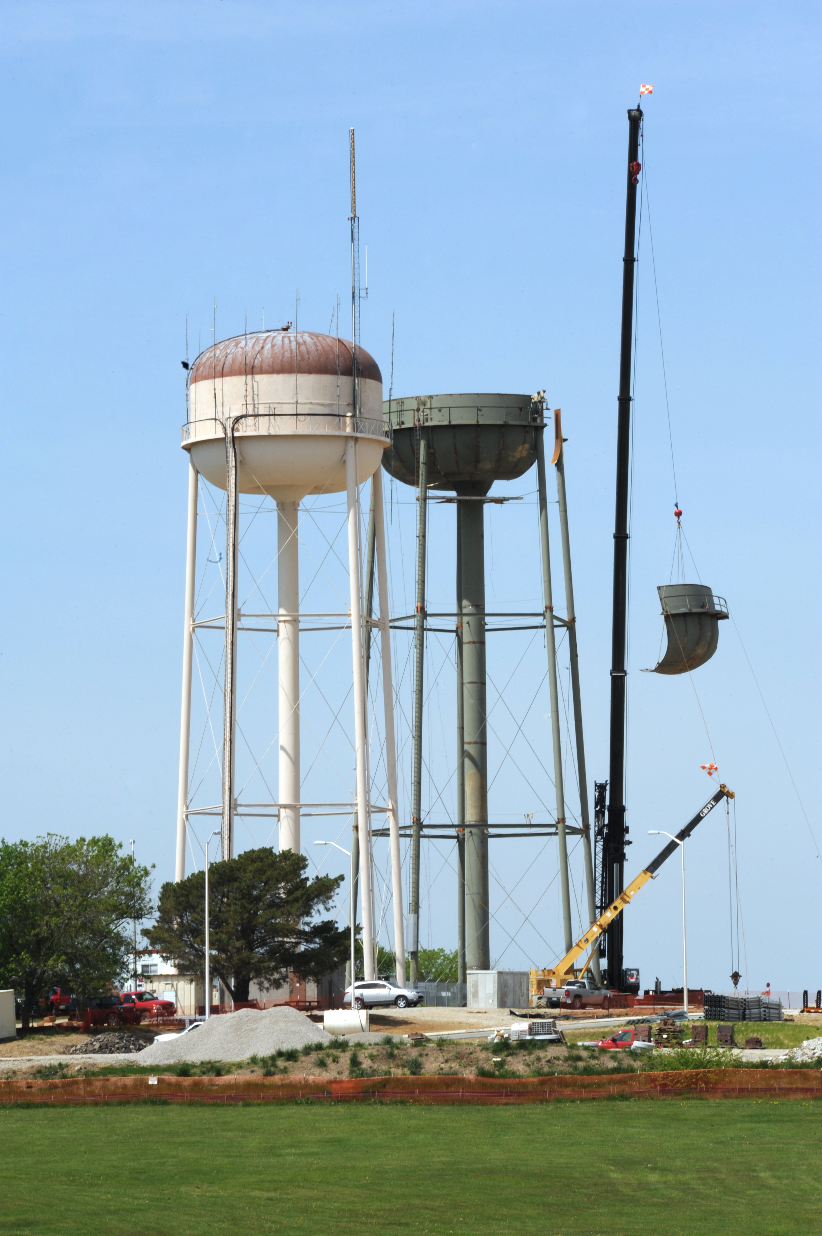 WHITEMAN AIR FORCE BASE, Mo. - The contracting crew lifts up the third piece of the bottom portion of the water tower bowl, April 28, 2010. The new water tower is being constructed on the south end of base, and will be one of two providing Team Whiteman with a constant water supply. (U.S. Air Force photo/ Airman 1st Class Carlin Leslie)