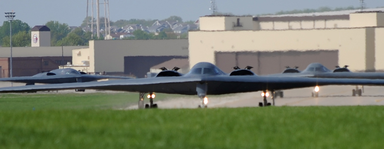 WHITEMAN AIR FORCE BASE, Mo. - Three B-2 Spirits taxi to the runway on their way to take part in an integration sortie with B-2s from Andersen AFB, Guam, April 19, 2010. The purpose of the exercise is to synchronize assets from Guam and Whiteman, and complete the combatant command's strategic vision of a simulated strike over a range in the Asia-Pacific region.(U.S. Air Force photo/Staff Sgt. Jason Huddleston)