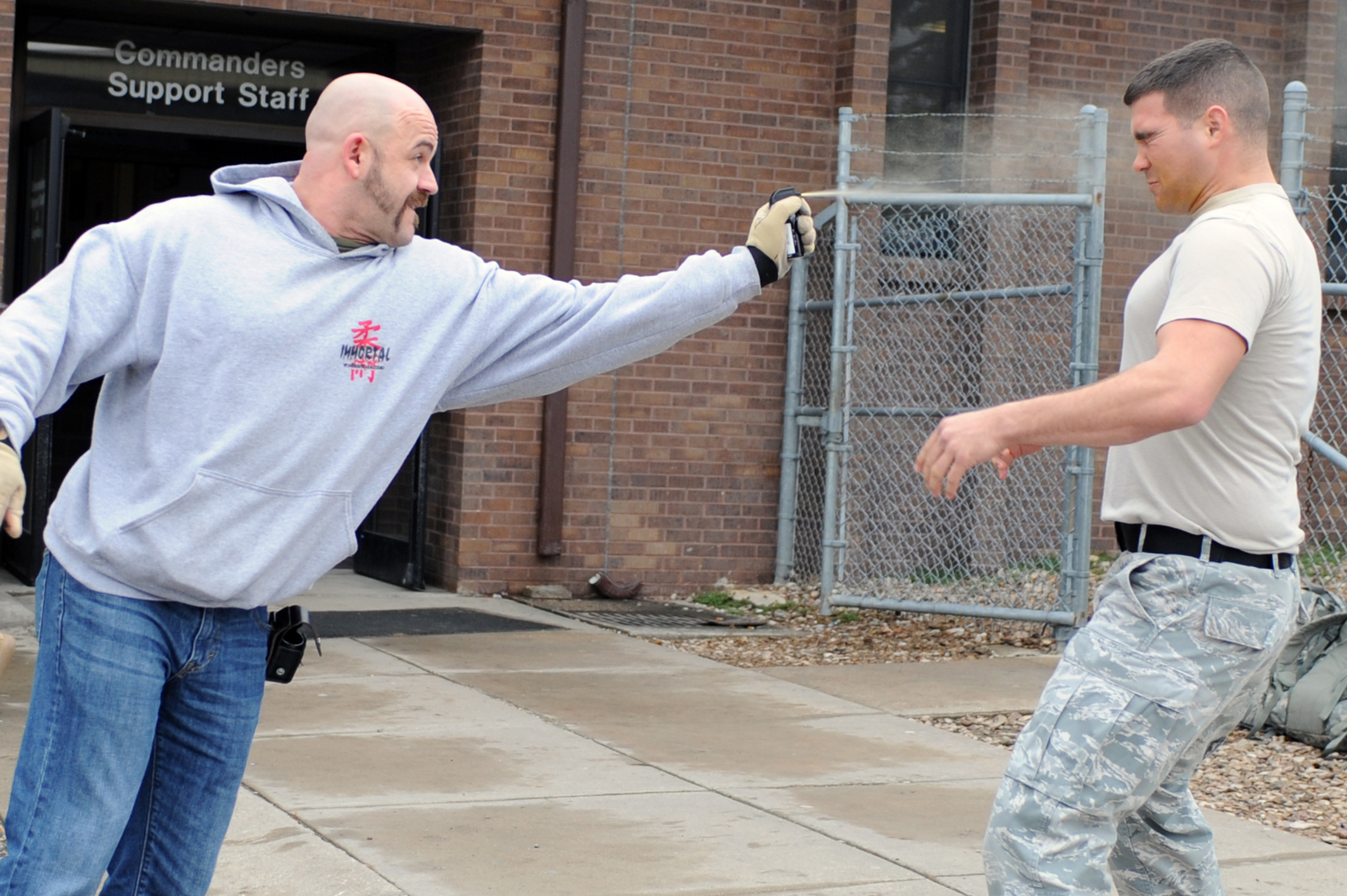 WHITEMAN AIR FORCE BASE, Mo, -- Senior Airman Edward Wilder 509th Security Forces Squadron gets pepper sprayed by Billy Matheny on March 17. Security Forces members must complete the course before they are qualified to carry pepper spray while on duty. (U.S. Air Force photo/Staff Sgt. Jason Huddleston)(Released)