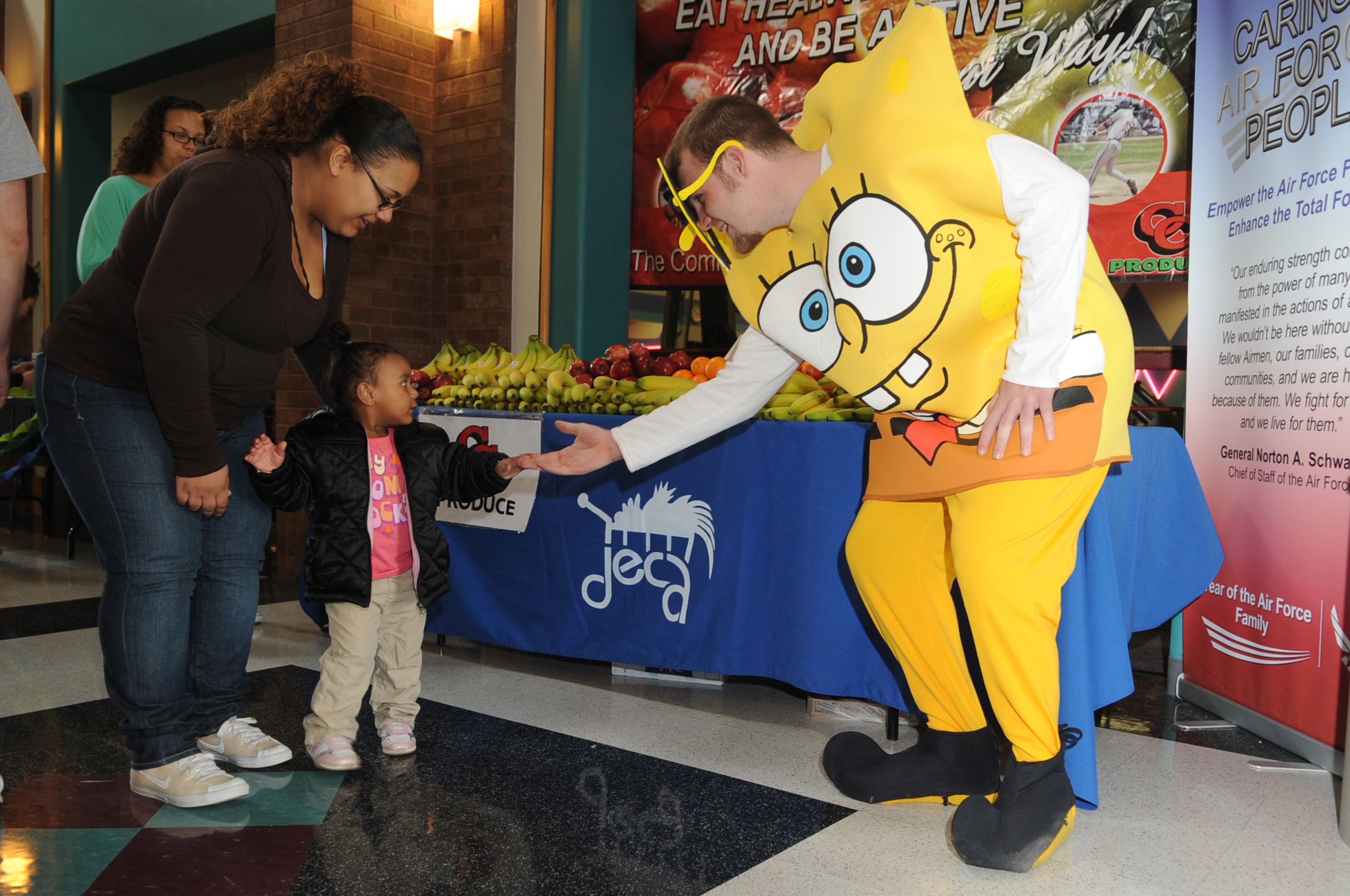 WHITEMAN AIR FORCE BASE, Mo., - Lezette Pereyra and D'amante Calderon high-five Spongebob Squarepants, played by Kyle Morgan, here, March 6, 2010. The activities were designed to involve the whole family in fitness and included parachute fun, towel volley ball, stuck in the mud and kids rush. (U.S. Air Force photo/Senior Airman Jessica Mae Snow) (Released)
