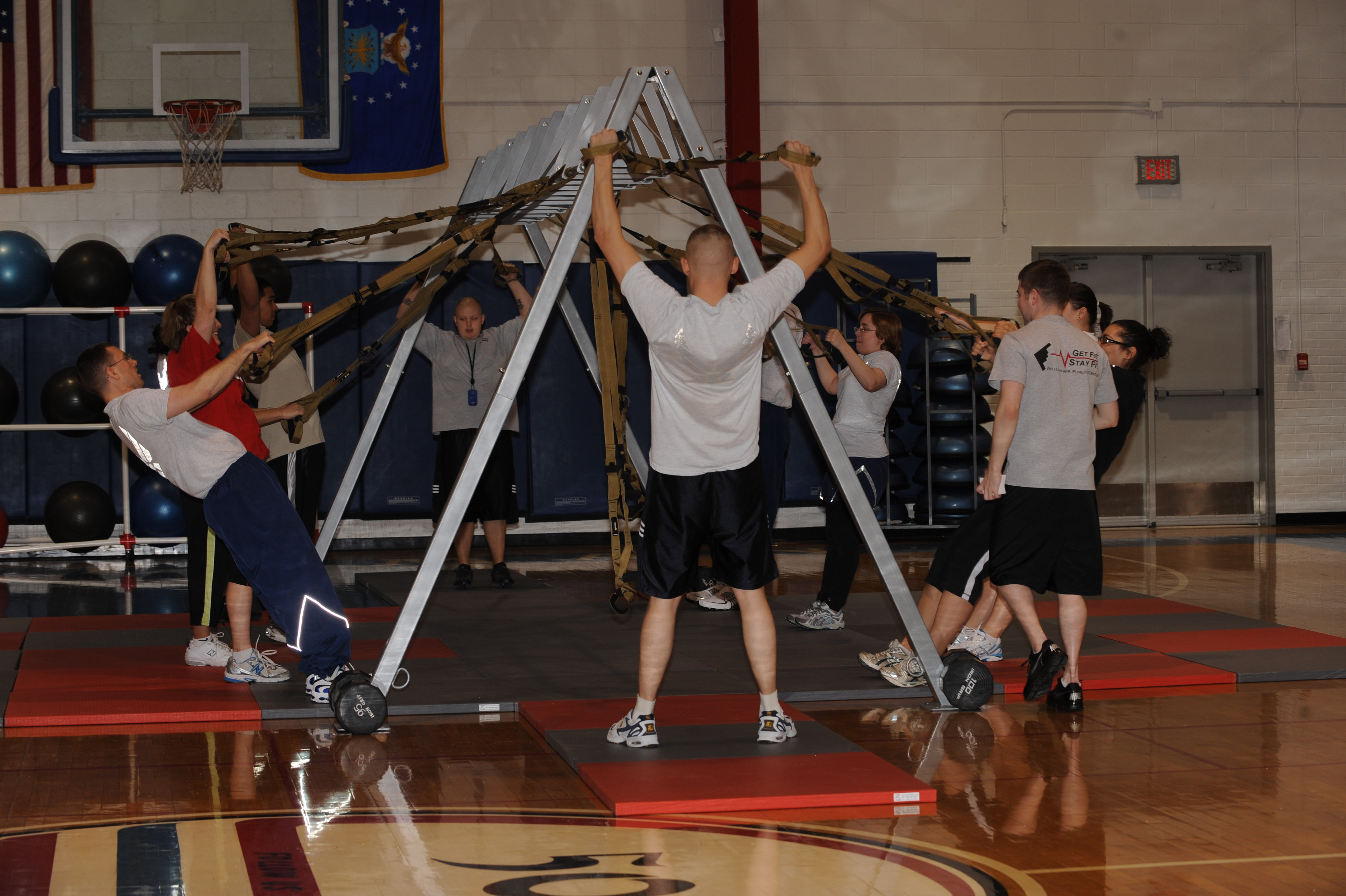 Members of Whiteman Air Force Base participate in a TRX demo offered at the fitness center during Wing Fitness Day Jan. 29, 2010. Several people came through the fitness center to partake in one or more of the 16 classes offered for complete body fitness. (U.S. Air Force Photo/ Senior Airman Cory Todd).