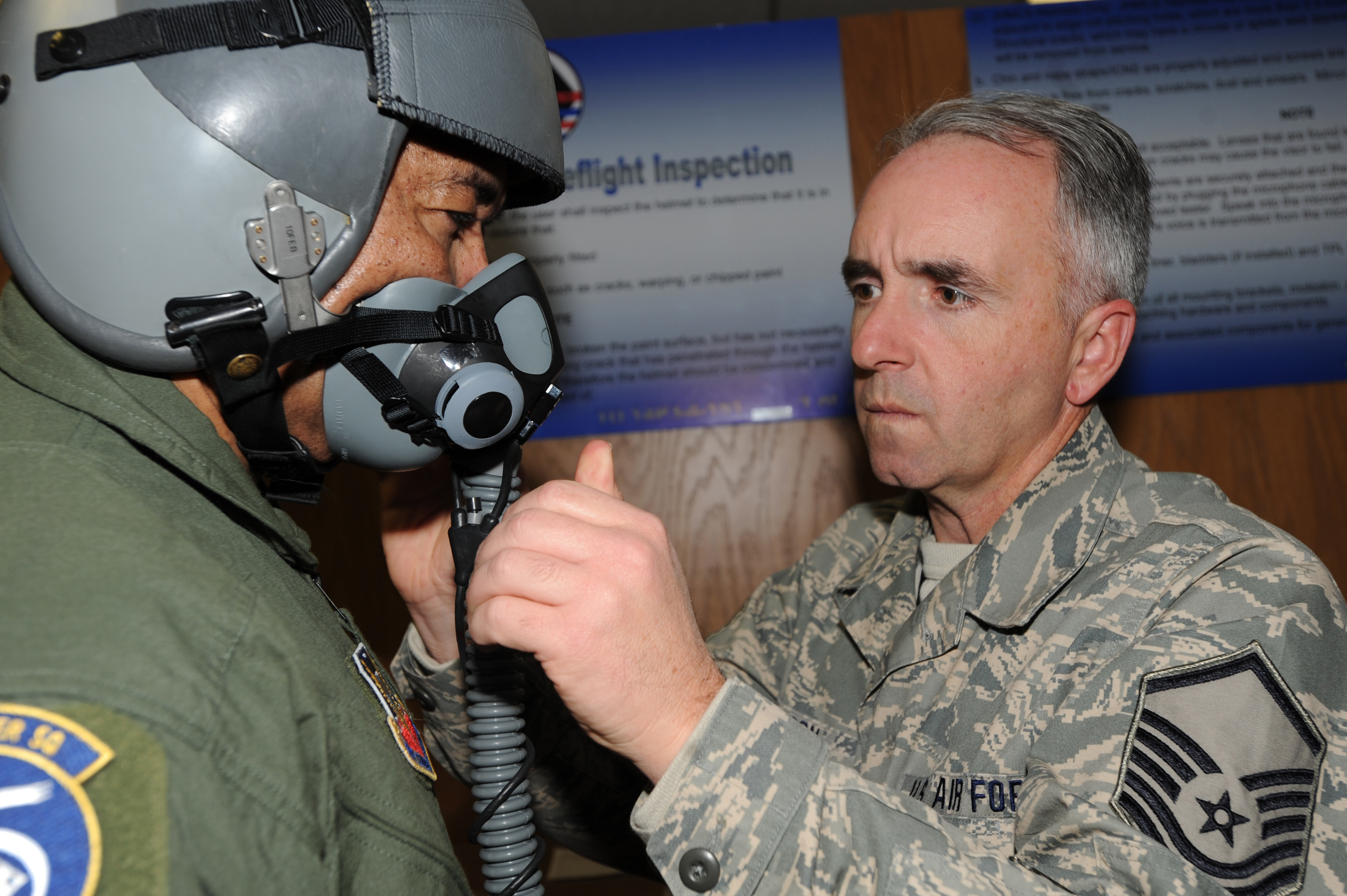 WHITEMAN AIR FORCE BASE, Mo.- Col. Michael Phelps, Air Combat Command Chief Financial Officer, is fitted for his oxygen mask by Master Sgt. Robert Wilson, 131st Bomb Wing, for his incentive flight, Dec. 9, 2009. Colonel Phelps, the chief financial officer for the largest operational command in the Air Force and the principal financial advisor to the ACC commander, visited the base prior to Whiteman's transition to Air Force Global Strike Command in 2010.(U.S. Air Force photo by Airman First Class Carlin Leslie)